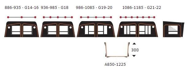 Optional extras: for assembly Annex 250, door canopy, net side, net front, Cosy Corner II, partition wall, front sun canopy, gutter, storm securing set.