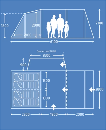 Fully sewn-in groundsheet, mesh doors, storage pockets, front and side doors plus a door in the drive-away tunnel.