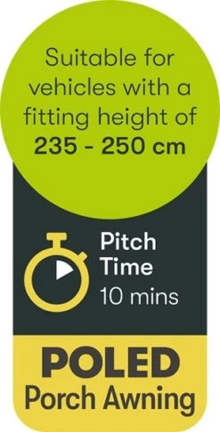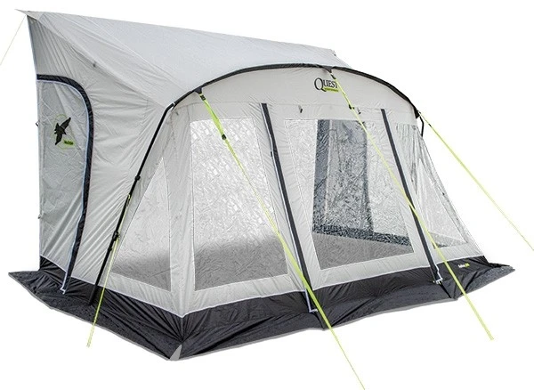 The awning is all about ease of use and value. It features an easy to use, minimal quick-fit pole system. This pole system is quick to put together, lightweight and adjustable to help ensure the best pitching even on uneven ground. The pitching is easy enough to be done by a single person if required. It uses the modern Quest Tec 75 fabric which is lightweight, quick drying and extremely waterproof making the awning easier to use and maintain. It is U.V. coated to help protect it from the harmful UV rays which helps extend its lifespan and gives you a U.P.F. rating of 50+ which is the highest possible giving you complete protection.